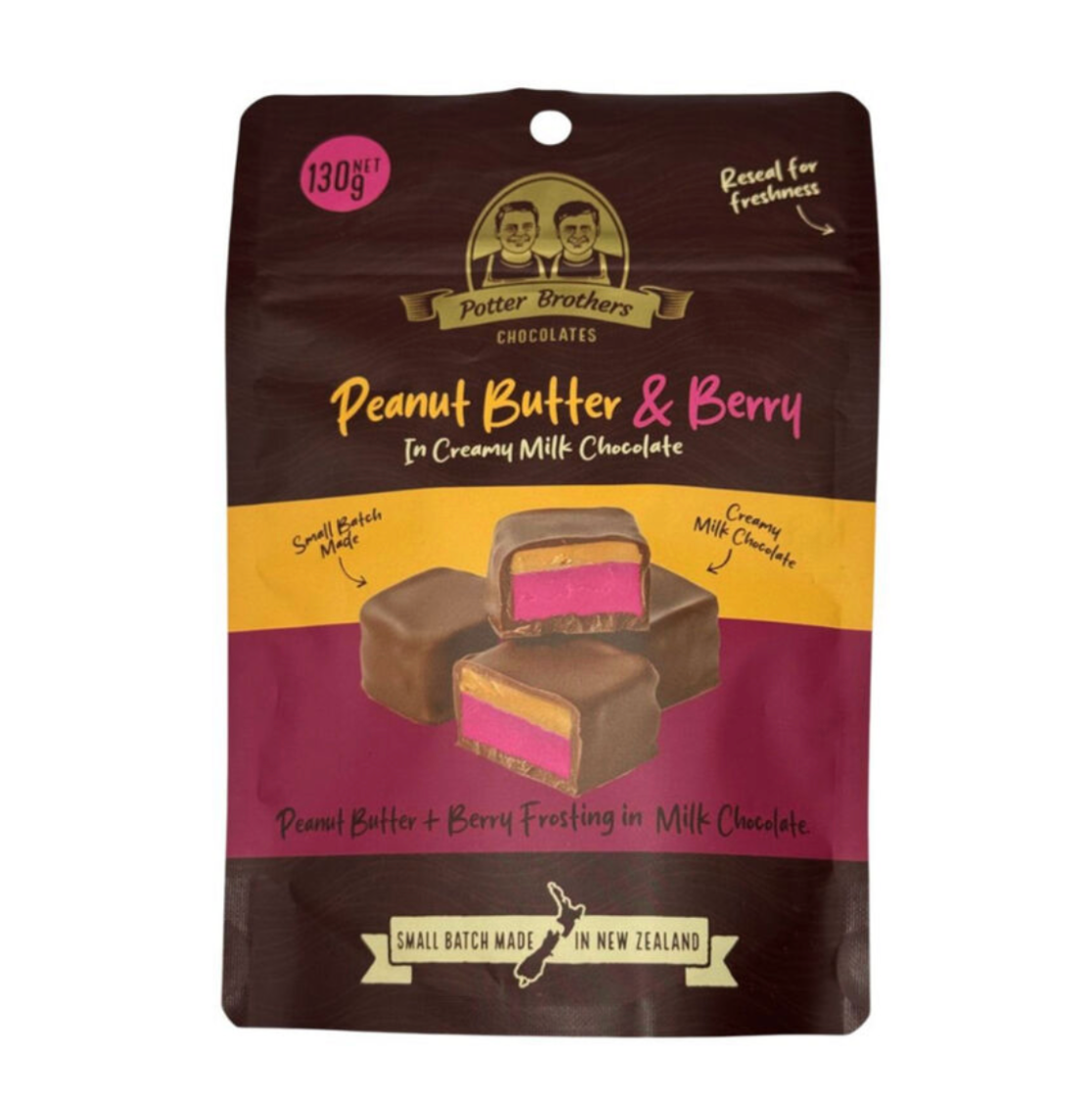 Introducing the newest creation from Potter Brothers—Peanut Butter and Berry in Milk Chocolate. This mouthwatering combination blends smooth peanut butter with a delicate berry frosting, all encased in their signature rich milk chocolate. Handcrafted in Levin, New Zealand, it's a perfectly balanced indulgence that’s sweet, creamy, and oh-so-satisfying.